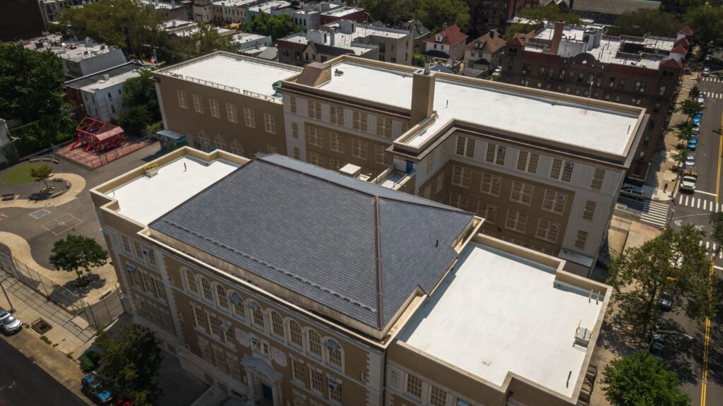 Army Construction LLC was contracted by the New York City School Construction Authority to perform a complete roof restoration and structural envelope rehabilitation at P.S. 102K in Brooklyn, New York. The scope of work included replacement of the existing slate roof system with new natural slate tiles, installation of new flashing and copper gutters, masonry repairs to chimneys and parapets, and the integration of modern waterproofing assemblies--all while preserving the historic character of the school's facade. The project required meticulous coordination and craftsmanship due to its heritage aesthetic and complex roof geometry featuring multiple hip ridges, crickets, and chimney junctions. All work was completed under occupied conditions with strict safety and noise control protocols per SCA standards.
